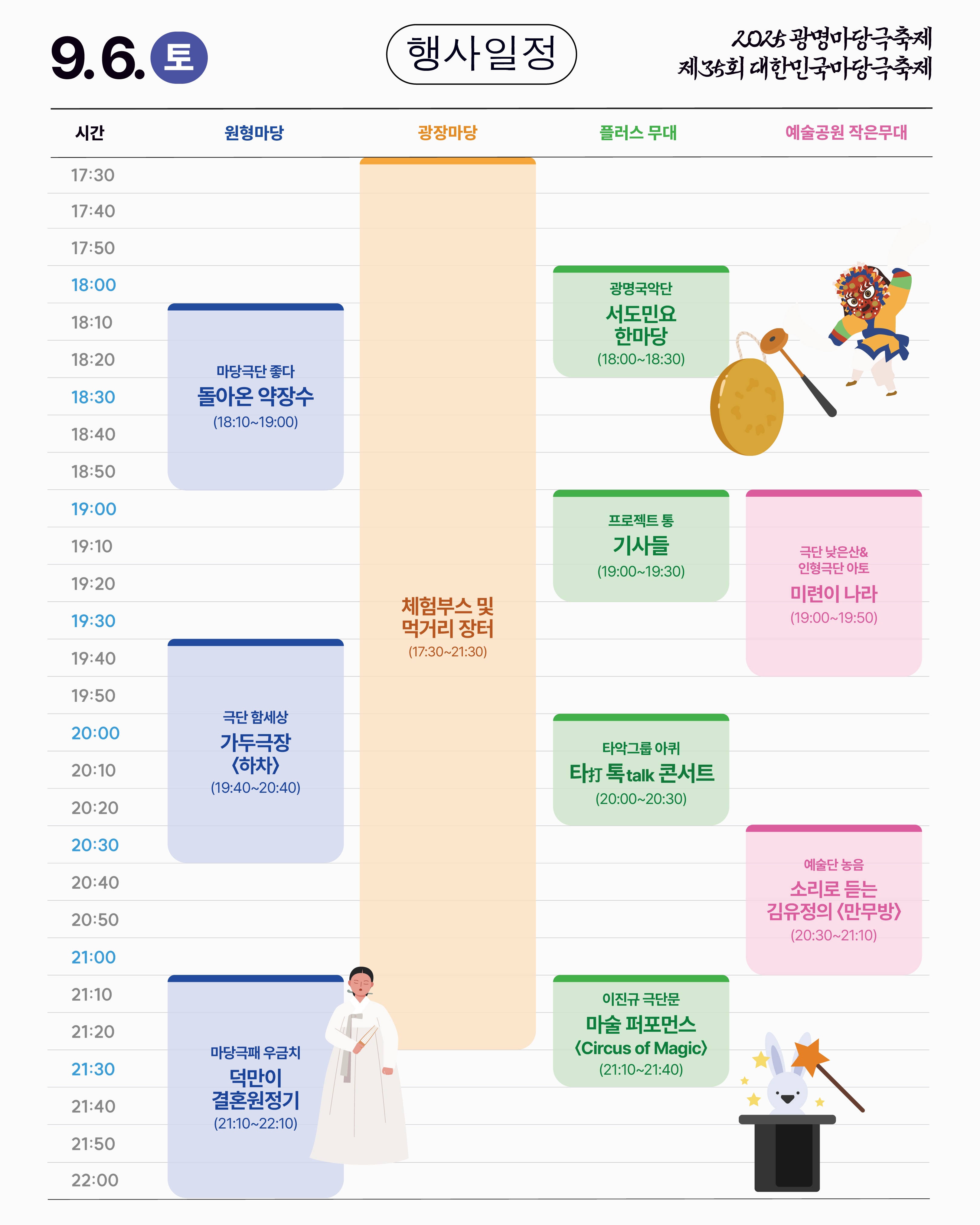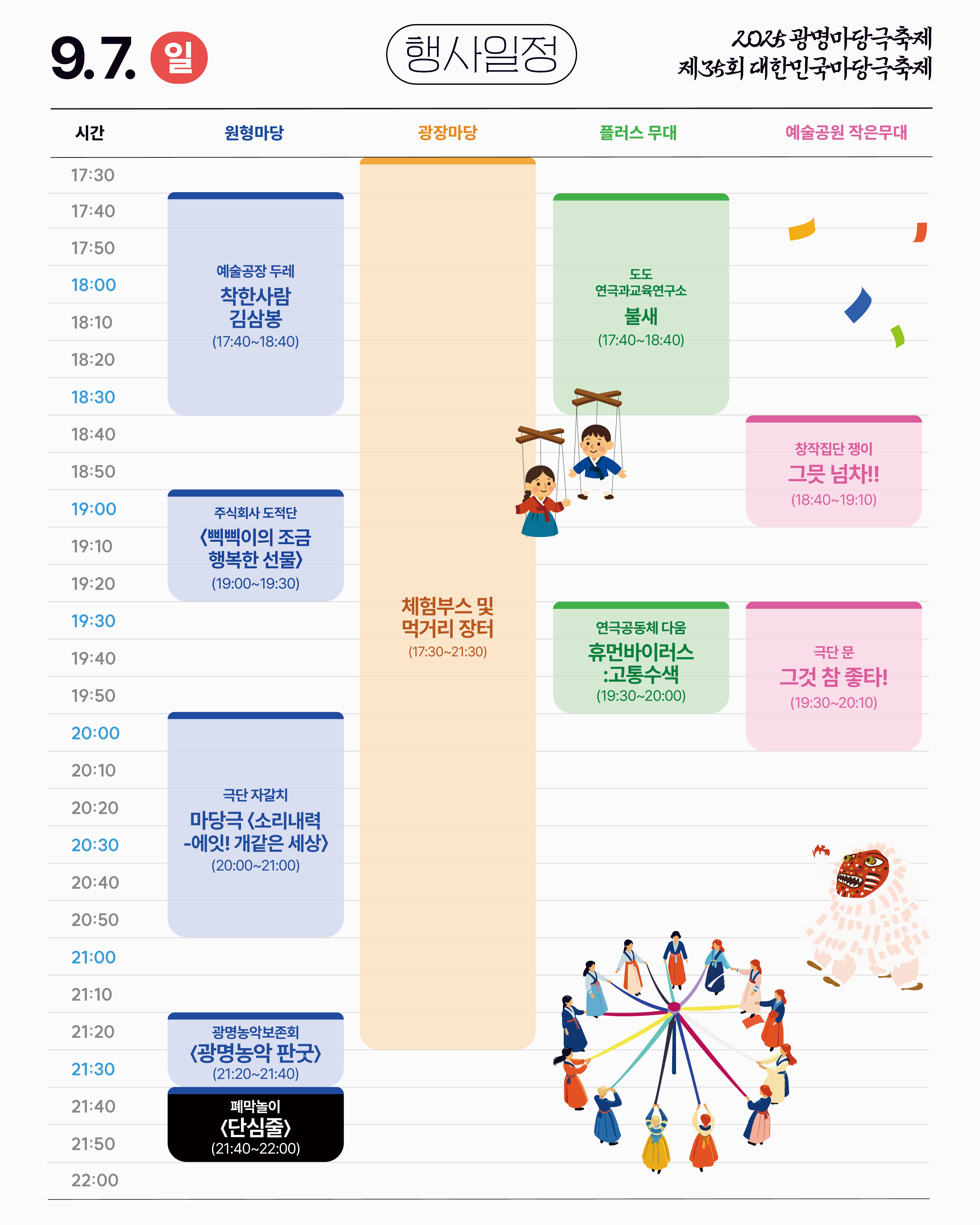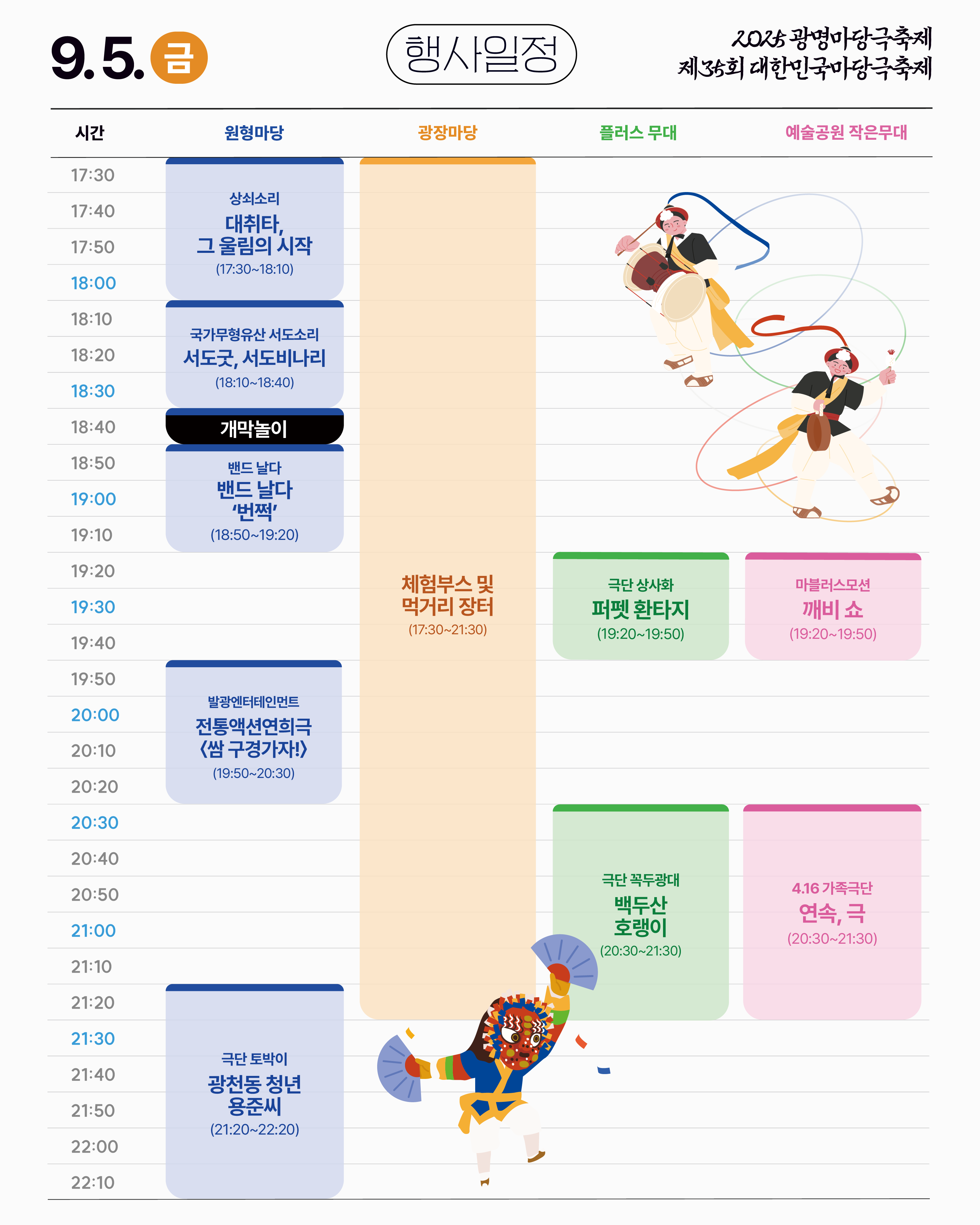 | 전통 마당극 | 국가무형문화재 초청 공연, 탈춤극, 전통놀이극 등 |
